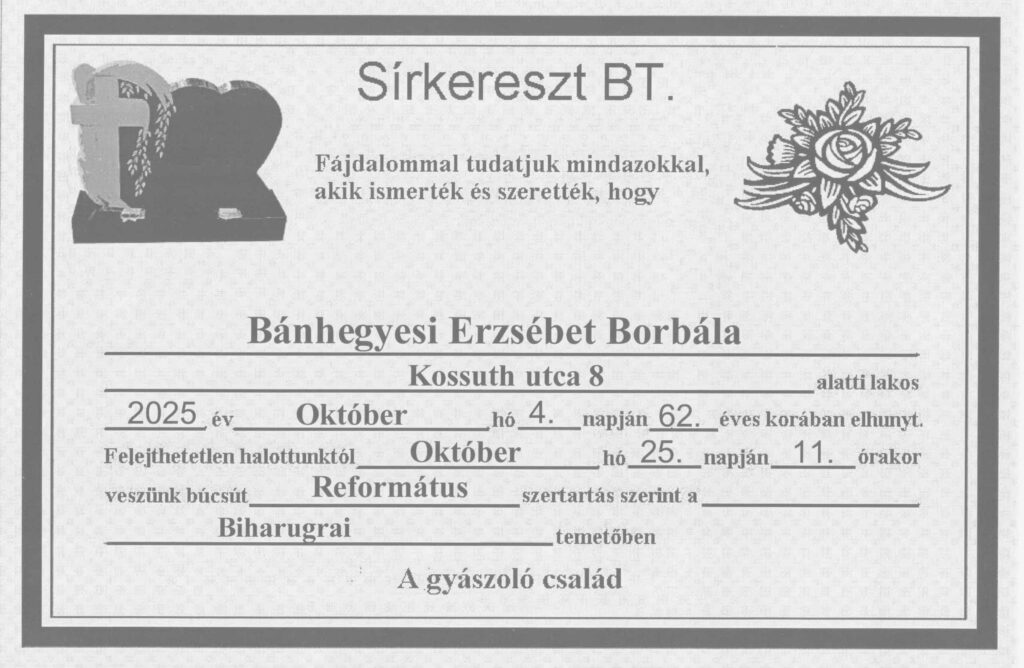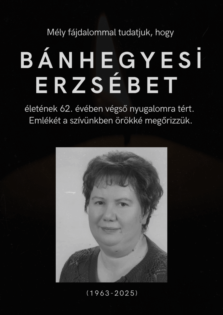 Mély megrendeüléssel és nagy szomorúsággal fogadtuk a gyászhírt, hogy szeretett kolléganőnk Bánhegyesi Erzsébet 2025. október 4-én elhunyt.
